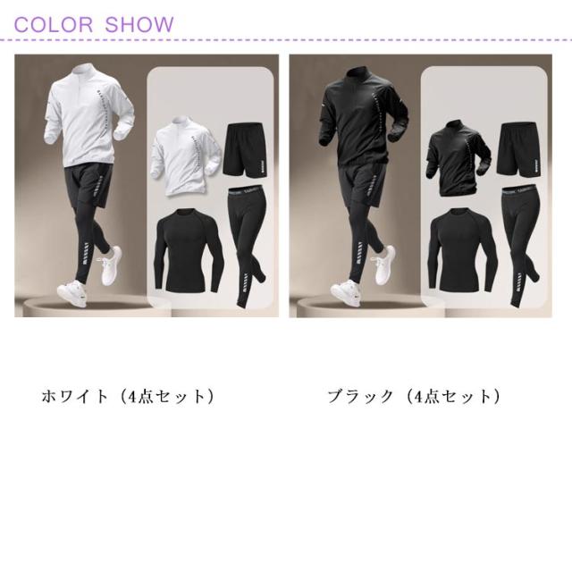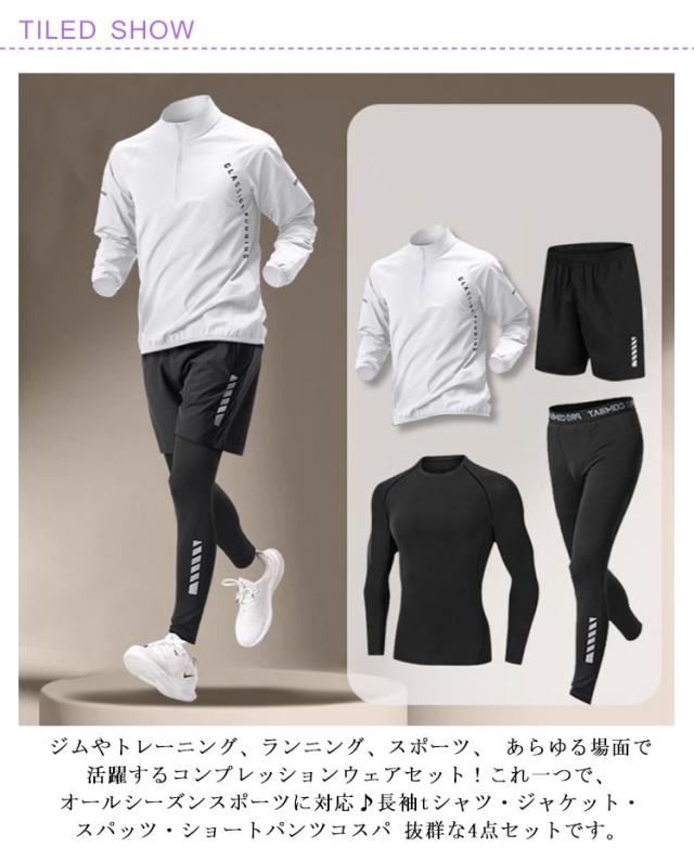 | ジムやトレーニング、ランニング、スポーツ、 あらゆる場面で活躍するコンプレッションウェアセット!これ一つで、オールシーズンスポーツに対応♪長袖tシャツ・ジャケット・スパッツ・ショートパンツコスパ 抜群な4点セットです。 通気性・速乾性・伸縮性に優れた生地を使用し、激しいスポーツ時でもサラッとした快適な着用感♪ 伸縮性に優れたコンプレッションウェア。伸縮性の高いストレッチ素材を採用。身体に圧をかけることで、さまざまなサポート効果をもたらす機能性ウェアです。どんな動きにも自然にフィットし、使用感抜群です。 様々なスポーツシーンで大活躍!スポーツフィットネス、ジョギング、ボクシング、散歩、ランニング、筋肉トレーニングサイクリング、登山、レジャー等スポーツに最適! | |