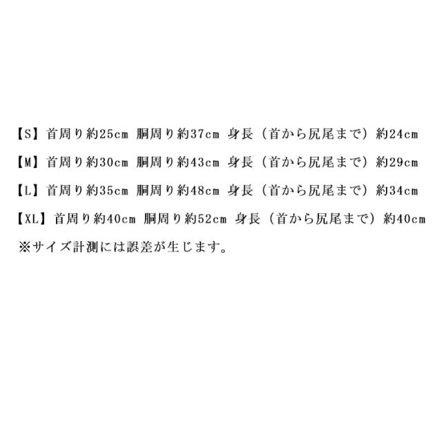 | サイズについての説明 | 【S】首周り約25cm 胴周り約37cm 身長(首から尻尾まで)約24cm 【M】首周り約30cm 胴周り約43cm 身長(首から尻尾まで)約29cm 【L】首周り約35cm 胴周り約48cm 身長(首から尻尾まで)約34cm 【XL】首周り約40cm 胴周り約52cm 身長(首から尻尾まで)約40cm ※サイズ計測には誤差が生じます。 |