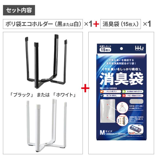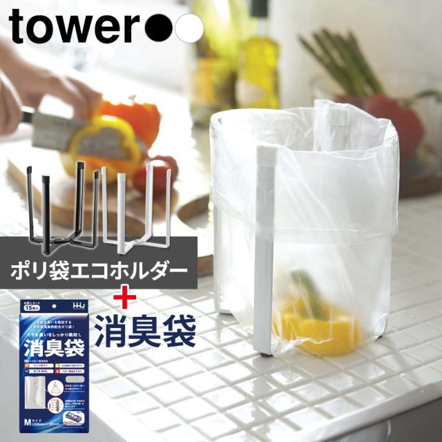 セット内容山崎実業 「tower(タワー)ポリ袋エコホルダー ブラックかホワイト」×1個、ハウスホールドジャパン「消臭袋 Mサイズ グレー 15枚入 AS03」×1個