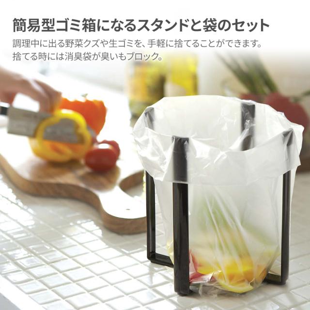 スーパーなどのポリ袋を掛けて、生ゴミなどが捨てられる簡易型ゴミ箱になるスタンドと、消臭袋のセット。