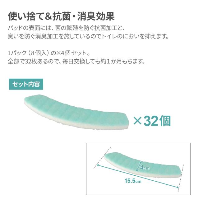 はねたおしっこを瞬間吸収、飛散による汚れを防ぐパッド(8個入り)の【4個セット】。全部で32枚あるので、毎日交換して約1か月分です。