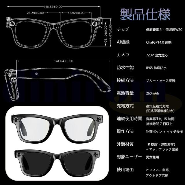 商品機能:Bluetetooth/ワイヤレス通話/音楽再生/ブルーライトカット/防UV/録画/録音/AI認識/高度なChatGPTのアクセス