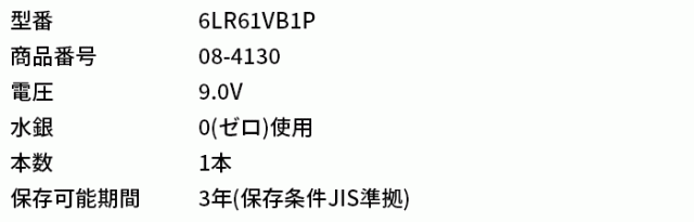 6LR61VB1P(08-4130)はは、各種コンピュータサプライ商品の企画・製造を手掛けているオーム電機社の、3年保存可能(保存条件JIS準拠)な、9V形アルカリ乾電池です。