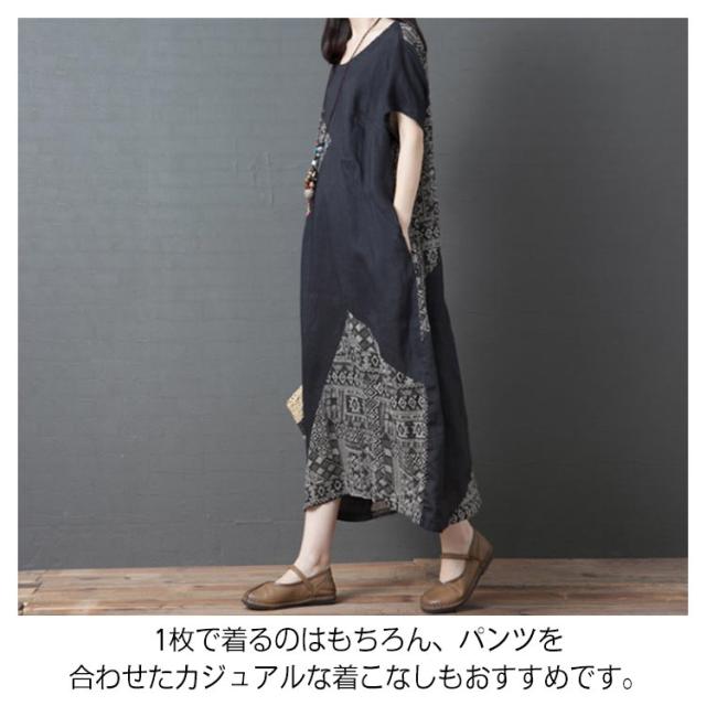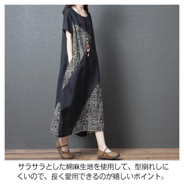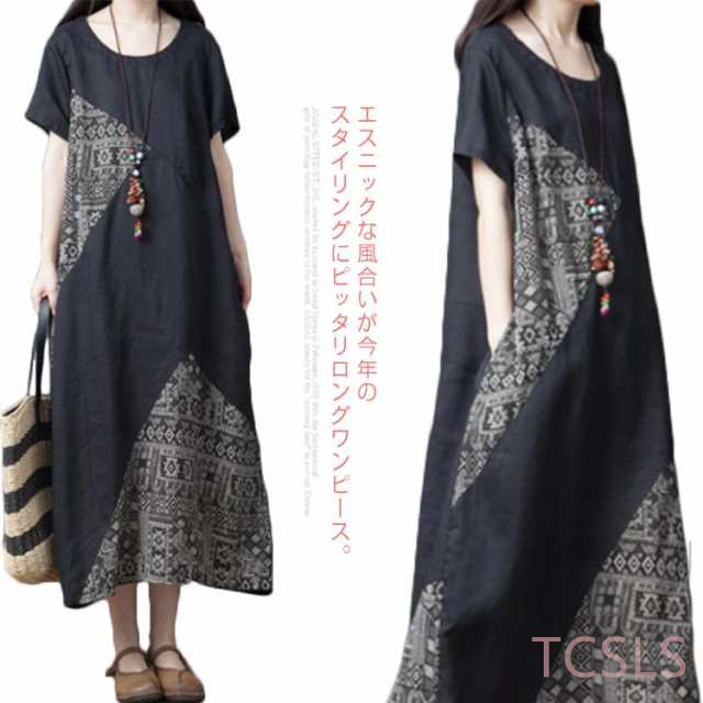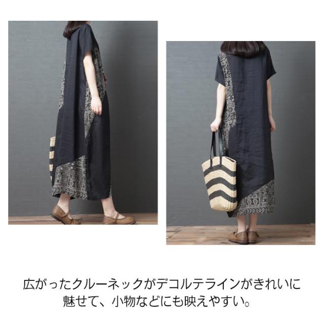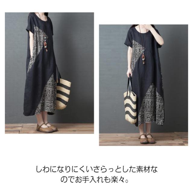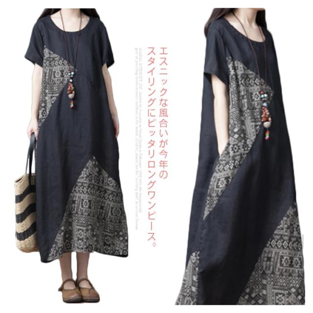 【送料無料】ワンピース マキシワンピース 切り替え 異素材 エスニック柄 アジアン ロングワンピース 半袖 クルーネック ロング丈 レディース 体型カバー きれいめ 大きいサイズ 着痩せ 秋 春 夏 大人 ゆったり カジュアル ナチュラル