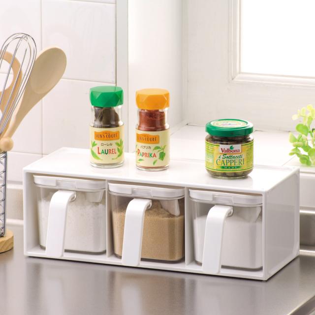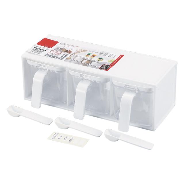 お料理に欠かせないお塩やお砂糖などの調味料が入るストッカー3個組です。小さじスプーン(5ml)が付属しているので直ぐにご使用いただけます。