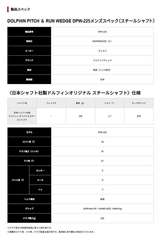 kasco ドルフィン ピッチ&ラン ウェッジ DPW-225(48度) メンズスペック シャフト:日本シャフト社製ドルフィンオリジナルスチールシャフト ロフト48° キャスコ