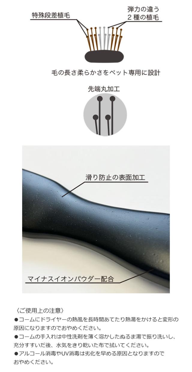・毛(ブラシ)をペット専用に柔らかく設計し、特殊段差植毛+毛先丸加工で皮膚・被毛に優しいシャンプーブラシです。