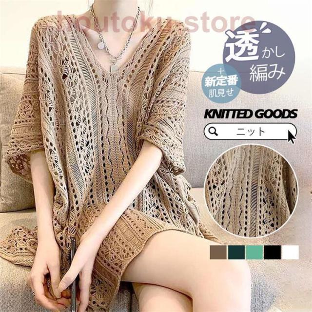 サマーニット レディース 半袖 トップス メッシュ編み プルオーバー 肌見せ ニットトップス ニット ドルマン カットソー 夏 透かし編み レイヤード 重ね着