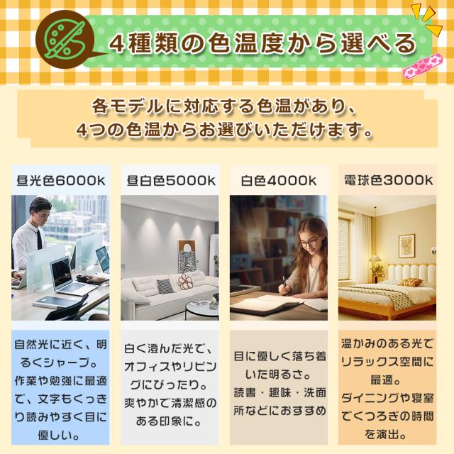 ・色温度:電球色3000K/白色4000K/昼白色5000K/昼光色6000K
