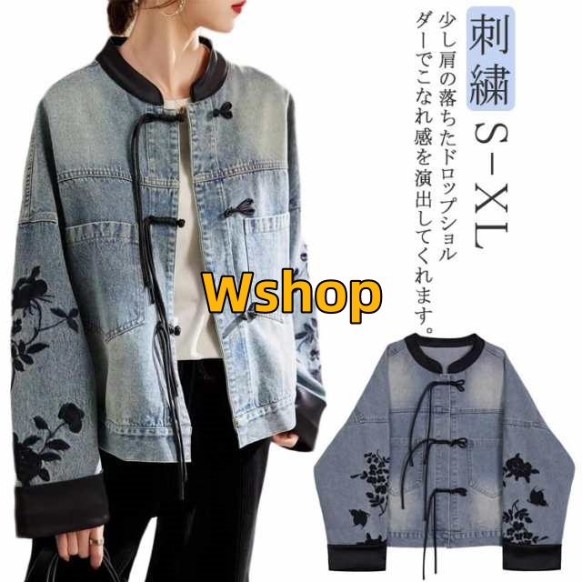 収納便利 レビュー高評価 デニムジャケット 長袖 大人 チャイナ風 刺繍 トップス オーバーサイズ レディース ノーカラー 花柄 コート アウター 春 ジャン ジージャン デニム ライトアウター ジャンパー 送料無料 ゆったり チャイナボタン 秋 カジュアル 夏 羽織り 在庫わずか