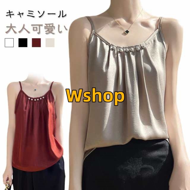 大人可愛い パール付き ゆったり プリーツ ギャザー キャミソール 大きいサイズ 下着 インナー レディース ネック サテン 【送無】 光沢感 サテン 春 フレア おしゃれ キャミソール 透けない きれいめ フェミニン 接触冷感 蒸れない 夏 体型カバー