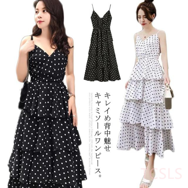 ワンピース レディース キャミソールワンピース ロングワンピース マキシワンピース ドット柄ワンピース ノースリーブ 無地 ドット柄 水玉柄 Vネック フレアワンピース 薄手 リゾート レトロ お洒落 カジュアル 夏物 夏新作