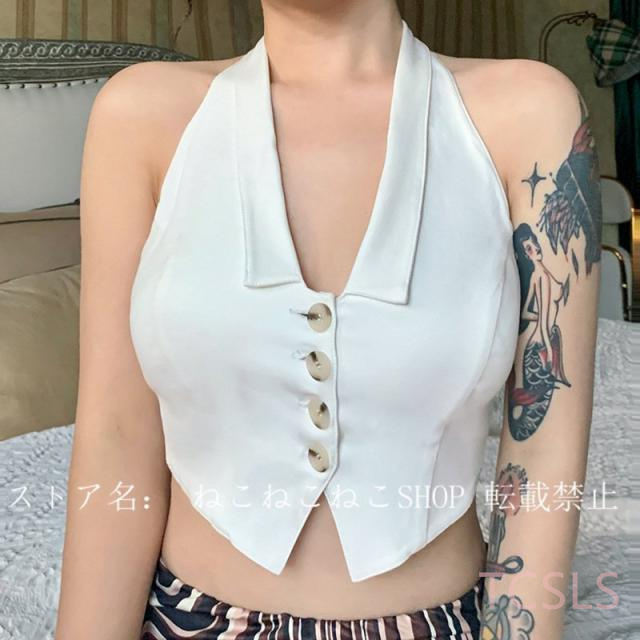 Vネック ホルターネック トップス レディース ノースリーブ タンクトップ ショート丈 へそ出し タイト トップス インナー 夏服 スリム 個性 セクシー