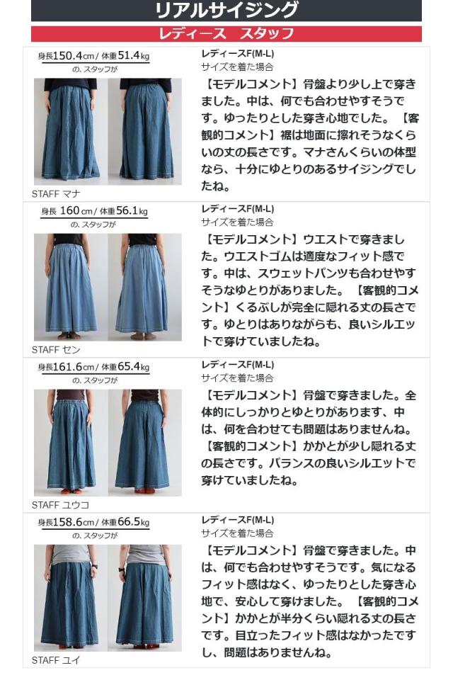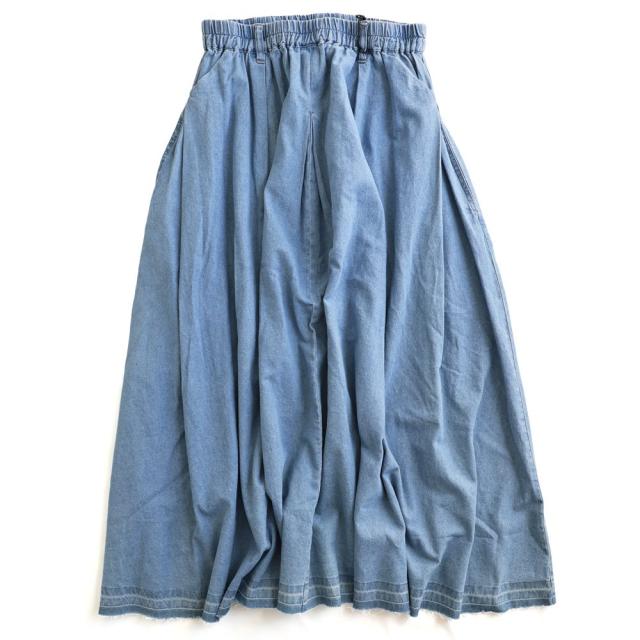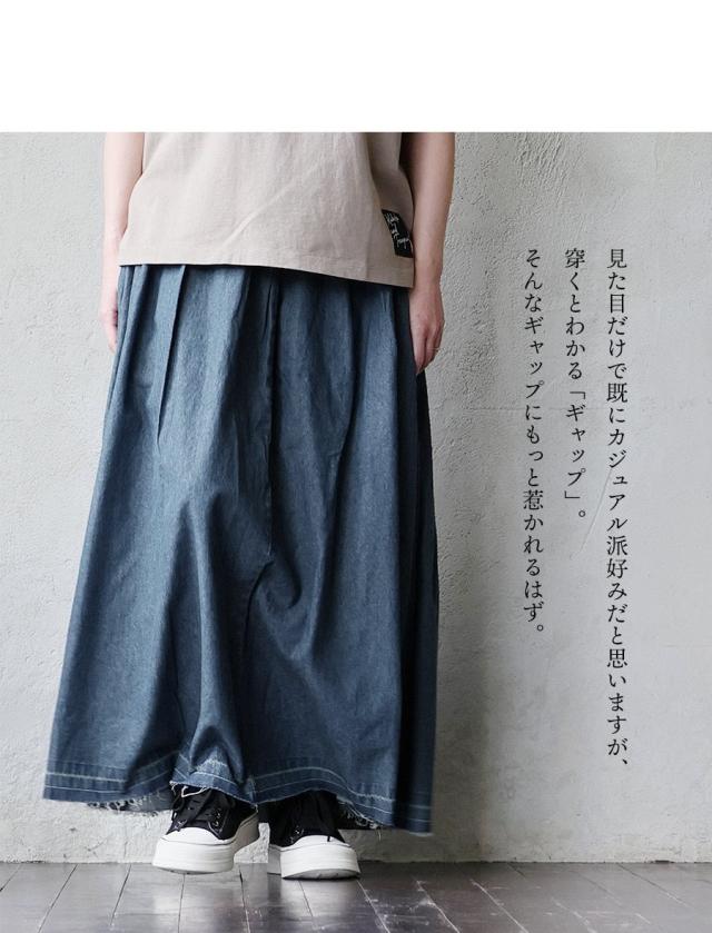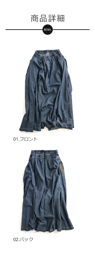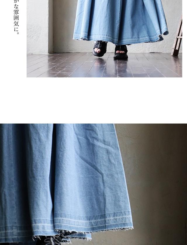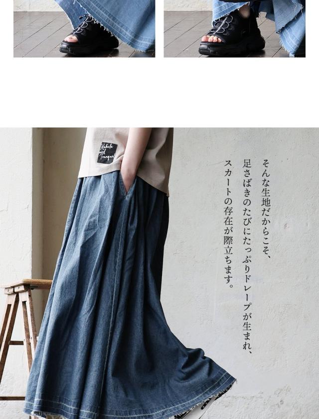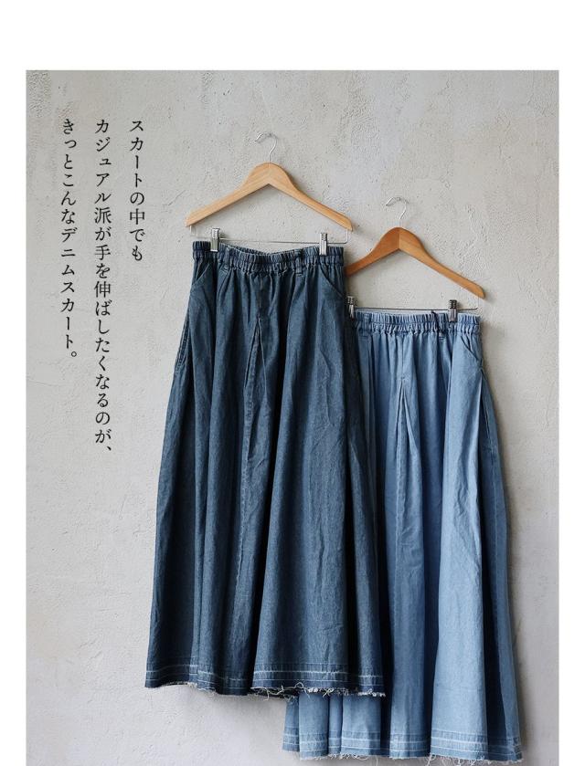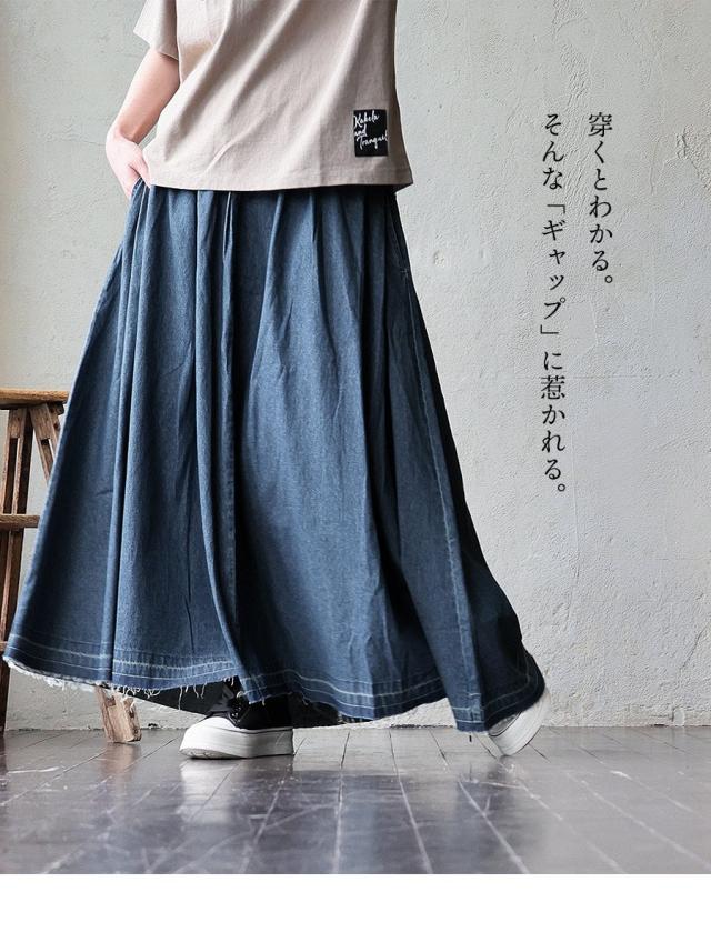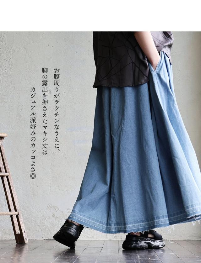 スカート フレアスカート マキシ丈 レディース 綿100 コットン デニム タック入り ポケット 軽やか カットオフ 体型カバー ウエストゴム すっきり 着痩せ カジュアル パティ