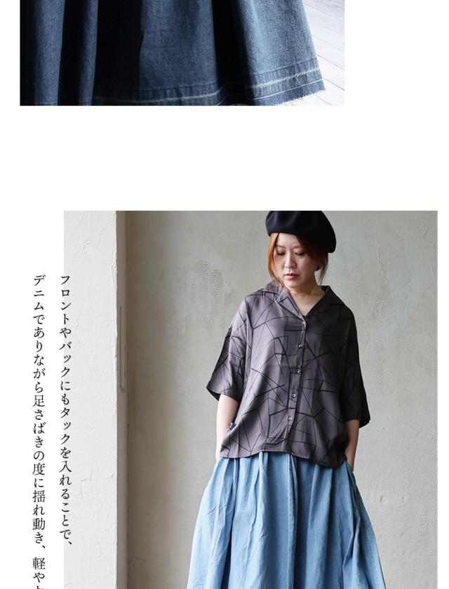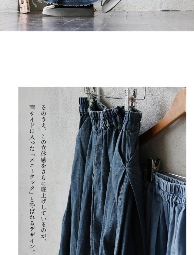 ・フロントやバックにもタックを入れることで、デニムでありながら足さばきの度に揺れ動き、軽やかな雰囲気に。