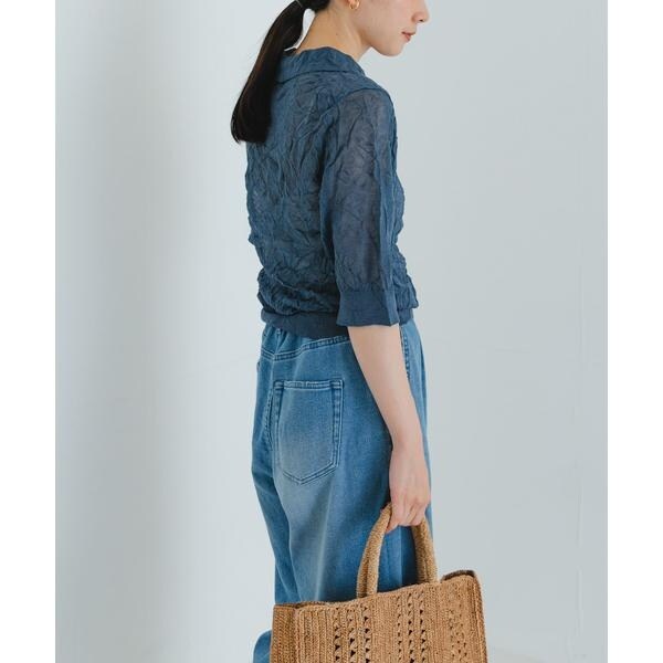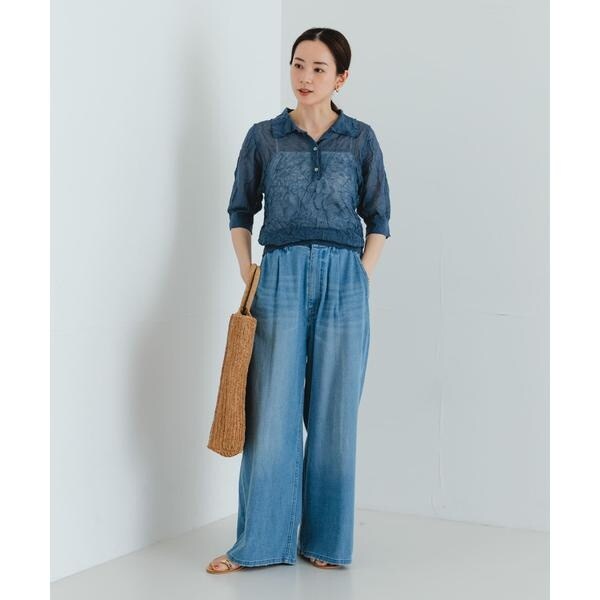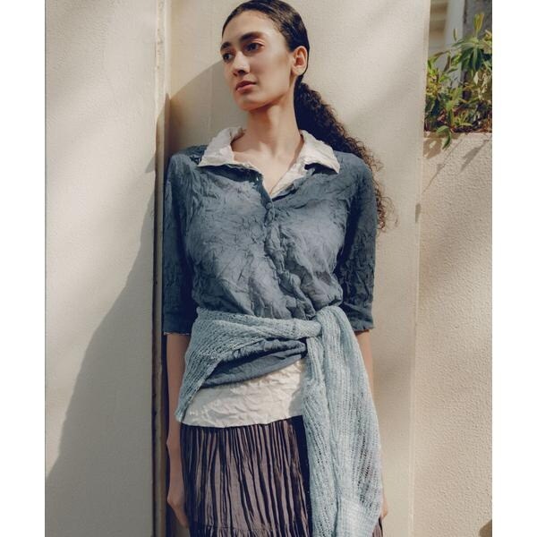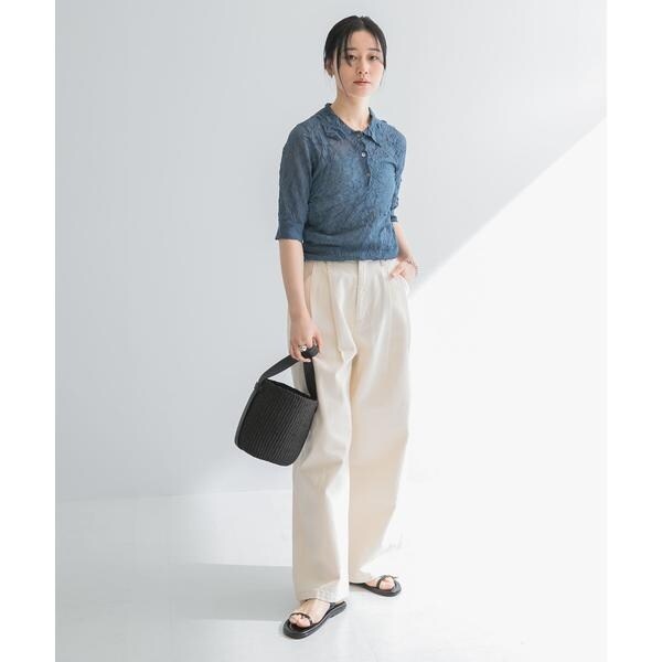 衿元は、ボタンを閉めて着用していただくのがおすすめ。ボトムスは、シンプルにスラックスやデニムを。アクセサリーで抜け感を出していただくと、女性らしいスタイリングに仕上がります。