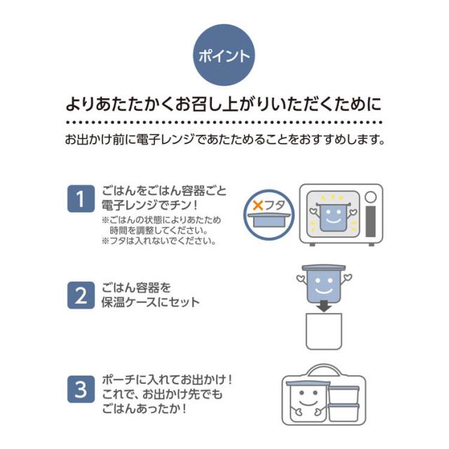 | 本体寸法:約幅19.5×奥行9.5×高さ10.5cm ※専用ポーチを含みません。 重量:約0.4kg ※専用ポーチを含みます。 おかず容器実用量:0.19L×2個 ごはん容器実容量:0.25L×1個、保温米飯容量(炊く前のお米の量):0.10L 保温効力(6時間)/保温ケースのみの場合:50度以上 保温効力(6時間)/保温ケースを専用ポーチに入れた場合:53度以上 ★材質 ・保温ケース:ステンレス鋼(アクリル樹脂塗装) ・ごはん容器:本体:ポリプロピレン/フタ:ポリプロピレン(発泡ポリプロピレン内蔵) ・おかず容器:本体:ポリプロピレン/フタ:シリコーンゴム ・ハシ:飽和ポリエステル樹脂 ・ハシケース:ABS樹脂 ・ポーチ:外生地・内生地:ポリエステル/クッション(断熱材):発泡ポリエチレン ※食洗機対応モデルです。 |