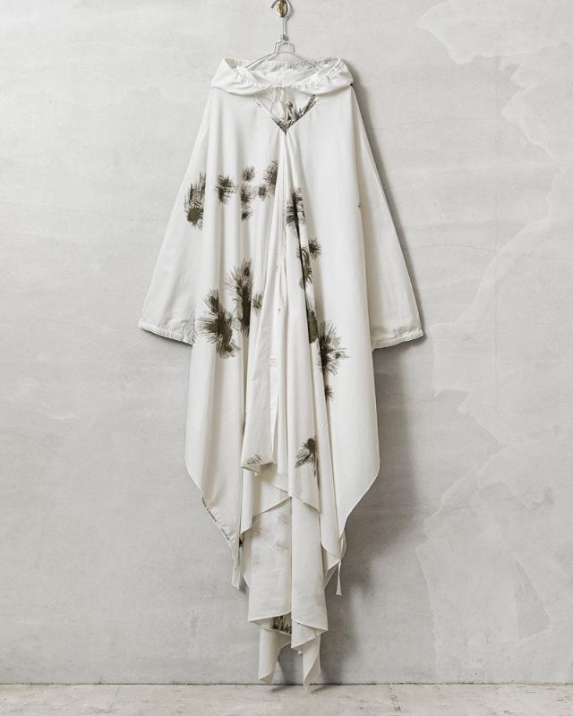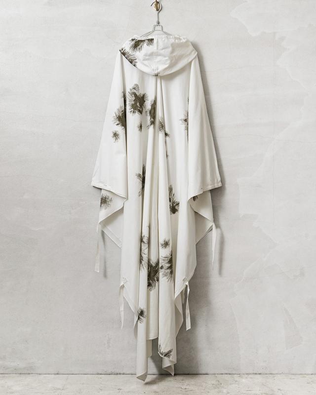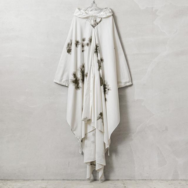 1960年代〜1970年代にかけて製造、使用されていたドイツ軍の雪上迷彩ポンチョが登場しました。雪上でカモフラージュする為に開発されており、白地に、欧米で一般に「パインリーフカモ」と呼称される棘のある葉のような柄が印象的。本来、着用している衣服の上から被るポンチョで、身動きしやすく、その他様々な事に使用出来る様に大きめに作られています。サイドに2箇所、フロント、バック裾上にそれぞれ1箇所ずつ紐が付いているので自由自在に形を変形可能。フード部分はドローコードで絞ることができ、袖口にもしっかりと補強が入っています。今ではほとんど見ることのできない色柄が目新しく新鮮。コットン生地の軽い着心地でライトアウターとしてはもちろん、さっと羽織るだけで周りと差が付くコーディネートのアクセントとしてもおススメです。