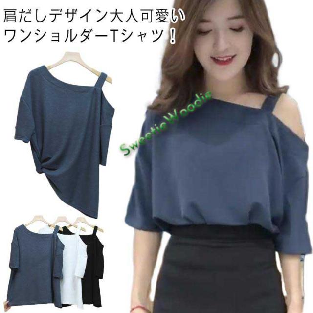 肩出し ショート丈 オフショルダー レディース トップス カットソー ワンショルダー シンプル Tシャツ シングル肩 ワンショルダー 肩だし 送料無料