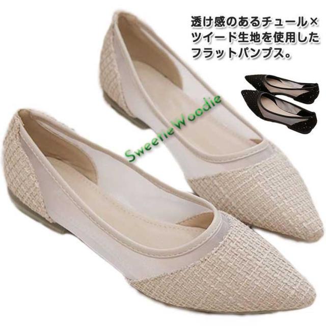 | 透け感のあるチュール×ツイード生地を使用したフラットパンプス。 程よい肌見せで足元に抜け感を与えてくれます。 お出かけやオフィスにもオススメです? カジュアルからきっちりスタイルまで◎ | |