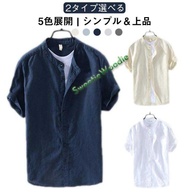 春夏 夏用 メンズ 綿麻 バンドカラーシャツ トップス スリム カジュアルシャツ 立ち襟 折り襟 半袖シャツ 無地シャツ バンドカラーシャツ 細身 2