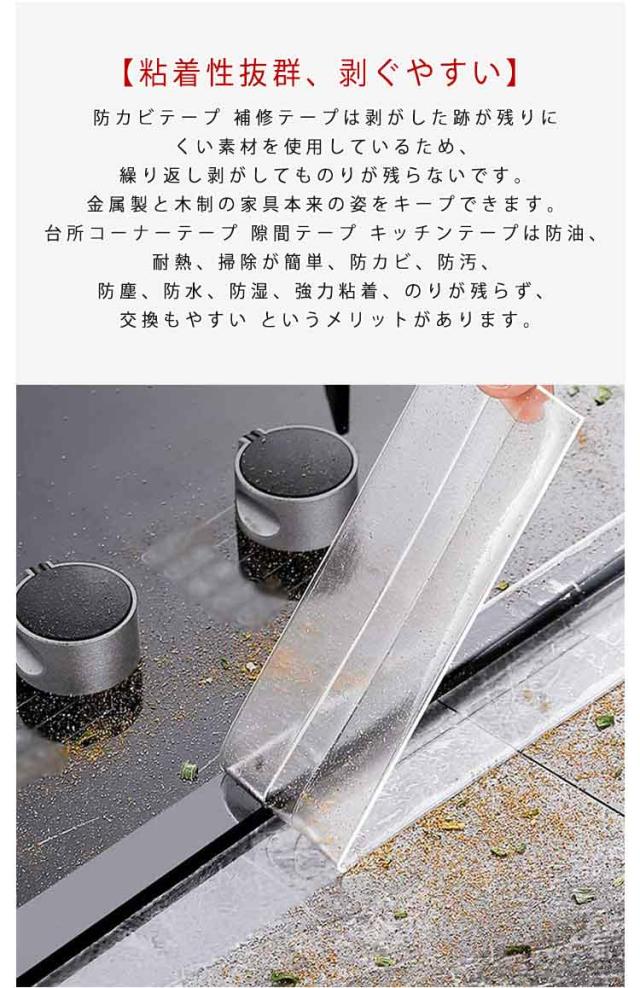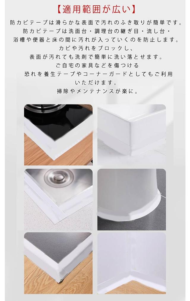 | 【隙間を守り、カビ防止】割れにくい防水防カビテープを貼るだけで、お掃除にくい隙間への水・汚れ・ゴミ・カビ・匂い等の難題を解消、お掃除は拭き取るだけですぐキレイになります。これからの梅雨季節には欠かせない一物です。浴室ドア、シリコンコーキング、洗面台、台所シンク等、水回りや床のひび割れの補修テープにも 【ハサミでカット出来、使い勝手】柔らかい素材でキッチンやシンクの形に合わせてカットできます。すき間テープの中央に折り線があるので、角度のある所でも簡単に貼ることができます。L字に貼りたい場合などは、幅広なタイプが活躍してくれます。シンクと壁の間はもちろん、洗面台の形によっては、蛇口の後ろの隙間もふさいでいきましょう 【粘着性抜群、剥ぐやすい】防カビテープ 補修テープは剥がした跡が残りにくい素材を使用しているため、繰り返し剥がしてものりが残らないです。金属製と木制の家具本来の姿をキープできます。台所コーナーテープ 隙間テープ キッチンテープは防油、耐熱、掃除が簡単、防カビ、防汚、防塵、防水、防湿、強力粘着、のりが残らず、交換もやすい というメリットがあります。 【適用範囲が広い】防カビテープは滑らかな表面で汚れのふき取りが簡単です。防カビテープは洗面台・調理台の継ぎ目・流し台・浴槽や便器と床の間に汚れが入っていくのを防止します。カビや汚れをブロックし、表面が汚れても洗剤で簡単に洗い落とせます。ご自宅の家具などを傷つける恐れを養生テープやコーナーガードとしてもご利用いただけます。掃除やメンテナンスが楽に。 | |