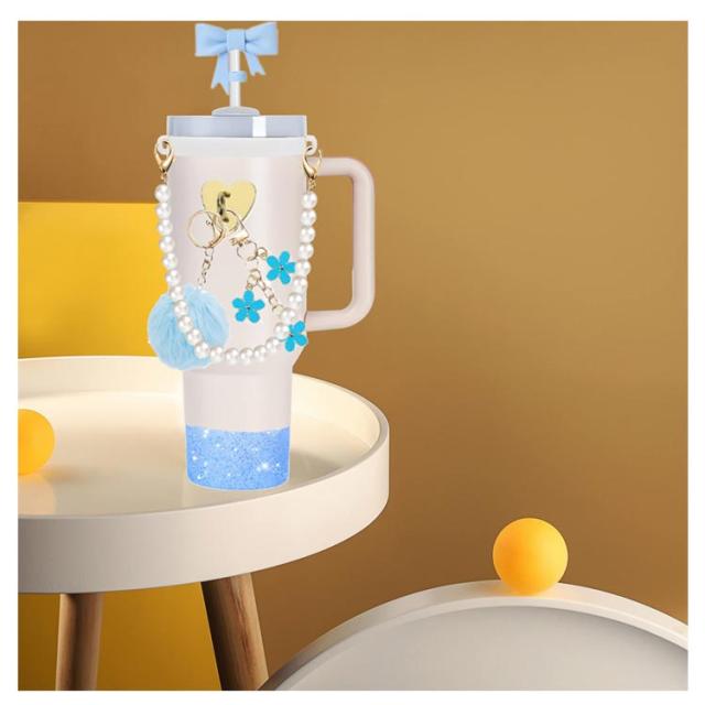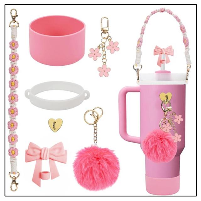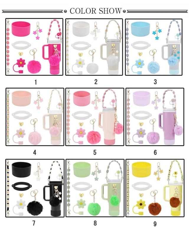 可愛い スタンレー用カップホルダー 【7点セット】 水筒ホルダー ストローキャップ 持ち運びやすい ポンポンチャーム 【7点セット】 ボトルホルダー 保冷 保温 水筒 タンブラー 底カバー シリコンカバー