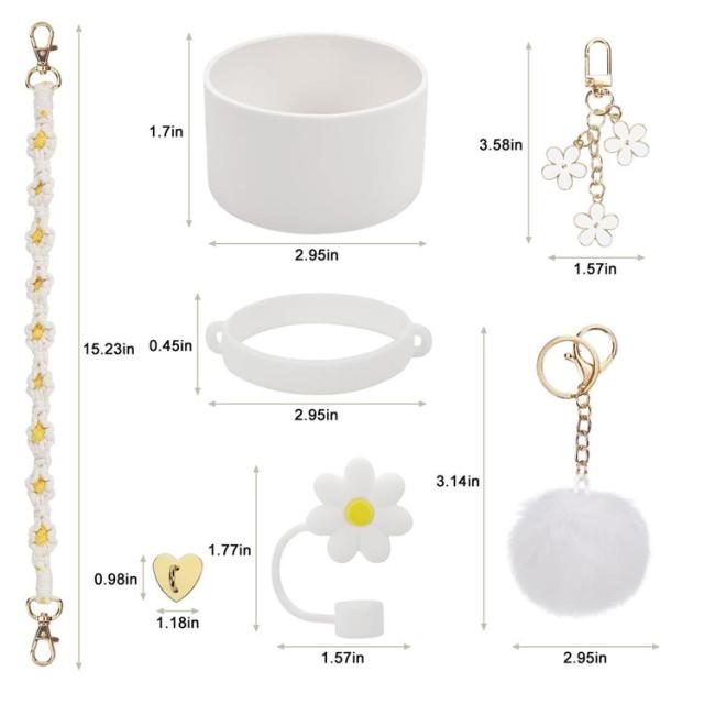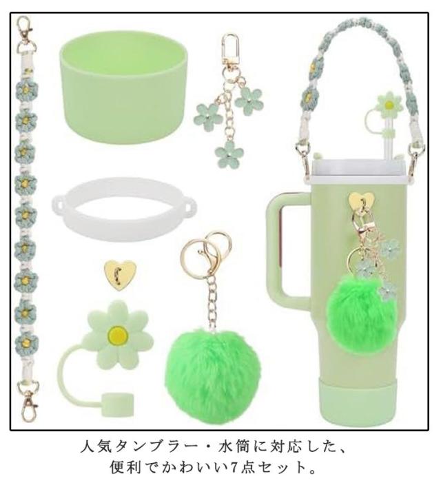 | サイズについての説明 | 7点セット内容:お花チャーム+ポンポンチャーム+ボトルホルダー+保護ブーツ+ストローキャップ+ハートフック+ハンドストラップ |