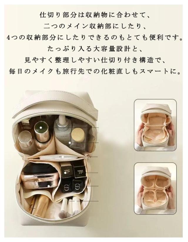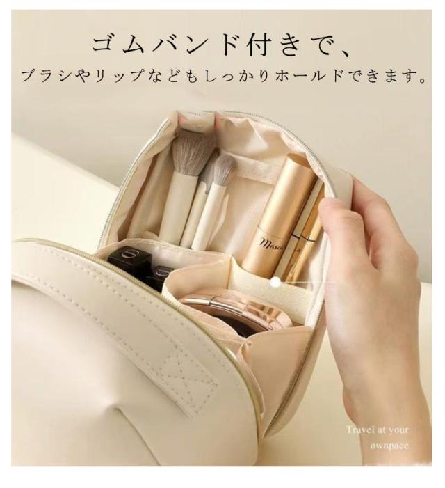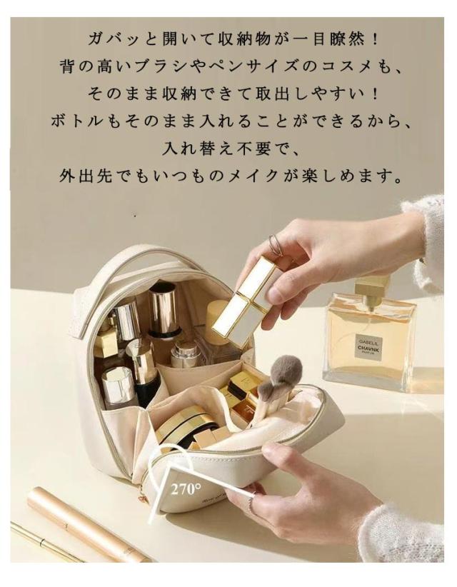 | ガバッと開いて収納物が一目瞭然! 背の高いブラシやペンサイズのコスメも、そのまま収納できて取出しやすい! ボトルもそのまま入れることができるから、入れ替え不要で、外出先でもいつものメイクが楽しめます。 ゴムバンド付きで、ブラシやリップなどもしっかりホールドできます。 ブラシホルダー部分にはビニール付きで、汚れたら拭いただけできれいになるメイクポーチです。 仕切り部分は収納物に合わせて、二つのメイン収納部にしたり、4つの収納部分にしたりできるのもとても便利です。 たっぷり入る大容量設計と、見やすく整理しやすい仕切り付き構造で、毎日のメイクも旅行先での化粧直しもスマートに。 水や汚れに強いから、洗面所など水回りでも安心して使用できます。 | |