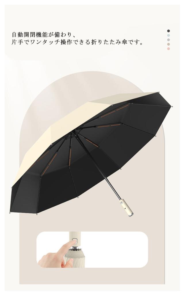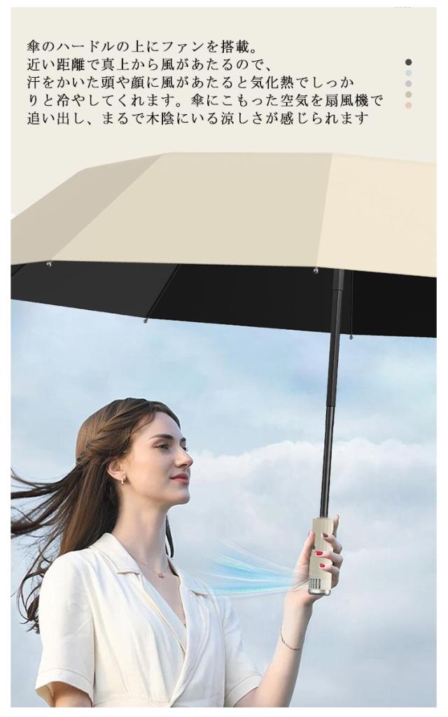 | ファン搭載!真夏の強い日差しを遮り、大切なお肌を太陽光線、紫外線からガードでき、日焼け対策アイテムとして猛暑を乗り切ります。 旅行やアウトドア活動に出かけるときに、紫 外線や雨をブロックするだけでなく。 天気が暑いときは、扇風機をオンにすることができます。クールな世界をお楽しみください 傘のハードルの上にファンを搭載。近い距離で真上から風があたるので、汗をかいた頭や顔に風があたると気化熱でしっかりと冷やしてくれます。傘にこもった空気を扇風機で追い出し、まるで木陰にいる涼しさが感じられます 耐久性のあるダブル骨デザインで一般的な傘よりはるかに頑丈で、豪雨、強風にもご安・心できます。 自動開閉機能が備わり、片手でワンタッチ操作できる折りたたみ傘です。 | |