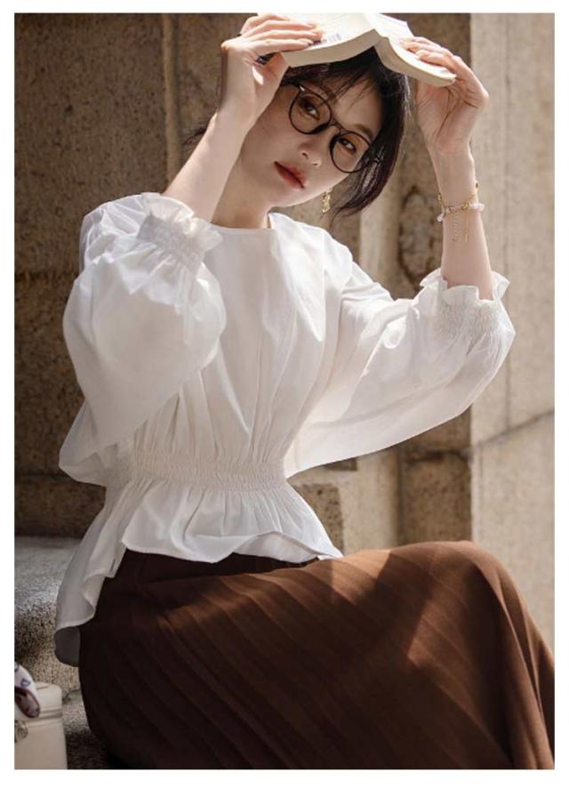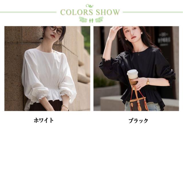 ボリュームパフスリーブブラウス ボリューム袖 バルーン パフスリーブ バルーンブラウス フレアトップス パフスリーブブラウス シャツ オフィス レディース ブラウス ボリュームパフスリーブブラウス 袖口ゴム クルーネック 着回し きれいめ シャツ