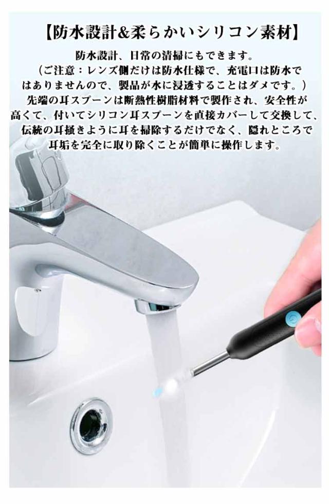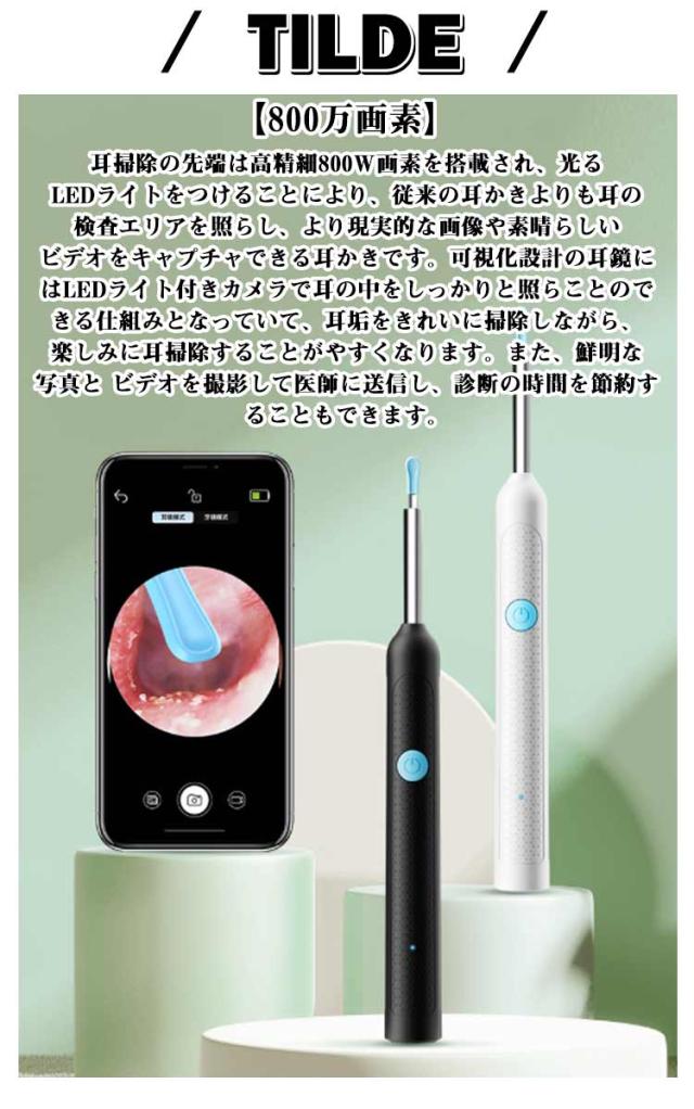 | 【カメラ付き耳かき】 【10点セット】 【防水設計&柔らかいシリコン素材】防水設計、日常の清掃にもできます。(ご注意:レンズ側だけは防水仕様で、充電口は防水ではありませんので、製品が水に浸透することはダメです。)先端の耳スプーンは断熱性樹脂材料で製作され、安全性が高くて、付いてシリコン耳スプーンを直接カバーして交換して、伝統の耳掻きように耳を掃除するだけでなく、隠れところで耳垢を完全に取り除くことが簡単に操作します。 【視覚化された耳かき&無線WIFI接続】最新アップグレード設計でWIFI発信機、ワイヤレス、カメラレンズを一体化にして、携帯電話とWIFIに繋がるだけで使用できます。Appをダウンロードして、ワイヤレスでWiFiに接続するだけで、耳の状況を簡単にチェックし、操作がより簡単に安全で耳かきをして、いつでも耳を掃除する楽しさを楽しみください。耳かきカメラは耳の掃除だけではない、内視鏡として耳の検査や鼻、口、喉、頭皮などの日常検査にも便利に使います。(ペットにもご利用可能です) 【800万画素】耳掃除の先端は高精細800W画素を搭載され、光るLEDライトをつけることにより、従来の耳かきよりも耳の検査エリアを照らし、より現実的な画像や素晴らしいビデオをキャプチャできる耳かきです。可視化設計の耳鏡にはLEDライト付きカメラで耳の中をしっかりと照らことのできる仕組みとなっていて、耳垢をきれいに掃除しながら、楽しみに耳掃除することがやすくなります。また、鮮明な写真と ビデオを撮影して医師に送信し、診断の時間を節約することもできます。 【Type-C充電&全機種対応を実現する&鏡効果】Type-C充電、充電式電池が内蔵されております。充電が速くて、使用時間が長くなります。Android&iOS に適用、スマホ&タブレット対応です。 【極細レンズ】レンズの内径はわずか3.5mmで、耳の奥で届けない隅や狭いところにもご利用できます。 | |