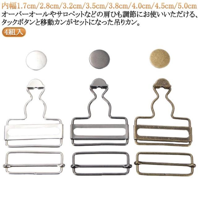 | 4組入!内幅1.7cm/2.8cm/3.2cm/3.5cm/3.8cm/4.0cm/4.5cm/5.0cm オーバーオールやサロペットなどの肩ひも調節にお使いいただける、 タックボタンと移動カンがセットになった吊りカン | |