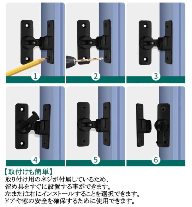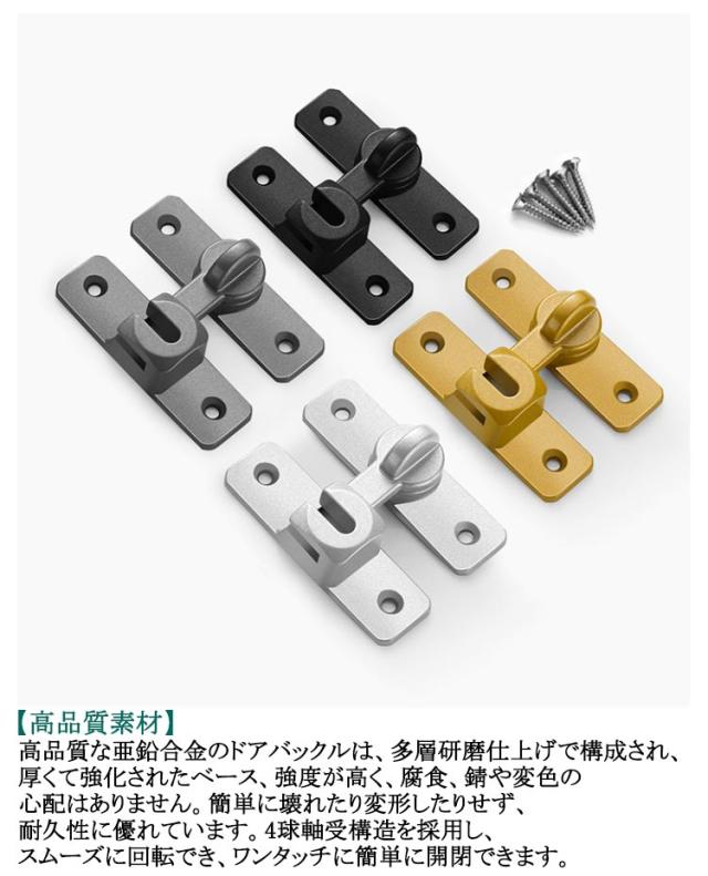 | 【90度・180度2WAY仕様】90度も180度も取り付けられるから、開き戸も引き戸も様々なドアに対応できます。 【高品質素材】高品質な亜鉛合金のドアバックルは、多層研磨仕上げで構成され、厚くて強化されたベース、強度が高く、腐食、錆や変色の心配はありません。簡単に壊れたり変形したりせず、耐久性に優れています。4球軸受構造を採用し、スムーズに回転でき、ワンタッチに簡単に開閉できます。 【便利でシンプル】便利なフリップデザイン、プライバシーロック、フラップは、より快適な生活環境のためにさらなるセキュリティを提供します。 【取付けも簡単】取り付け用のネジが付属しているため、留め具をすぐに設置する事ができます。左または右にインストールすることを選択できます。ドアや窓の安全を確保するために使用できます。 【安全保護】子供ケガ防止だけでなく、部屋の外に出ていかないようにしたり、様々な危険を防止できます。簡単施錠でスライドドアの防犯対策ができます。猫の脱走防止用としてもお使いいただけます。 【幅広い用途】引き戸や部屋のドア、引き出し、バスルーム、オフィス、ホテルなど様々な場所や用途に使えます。 | |