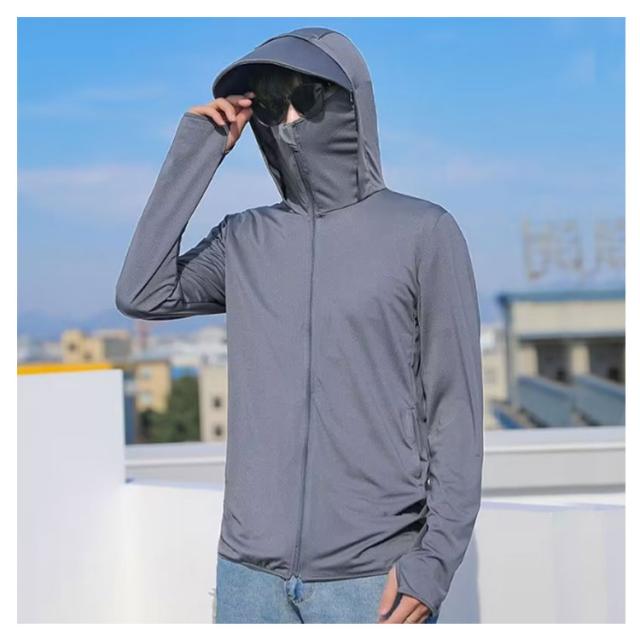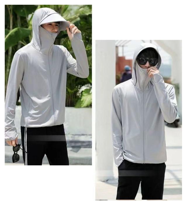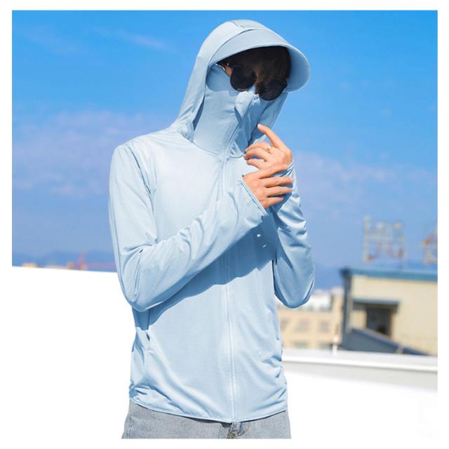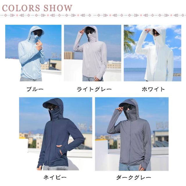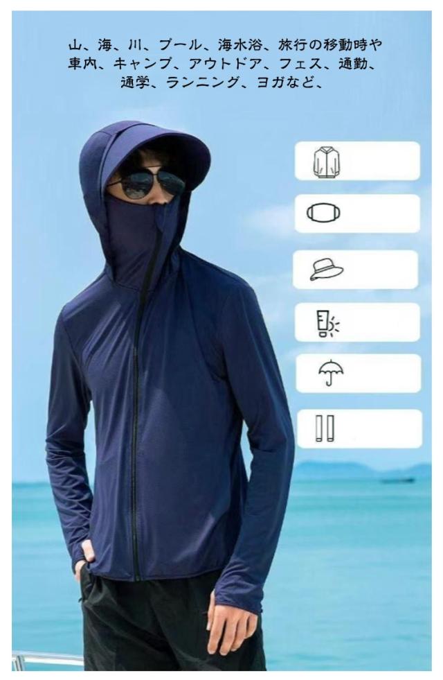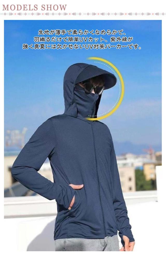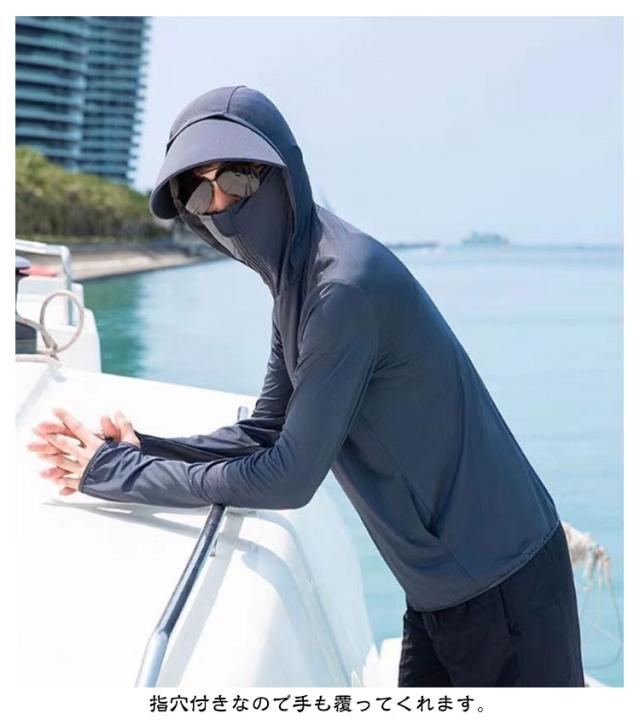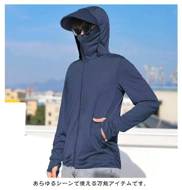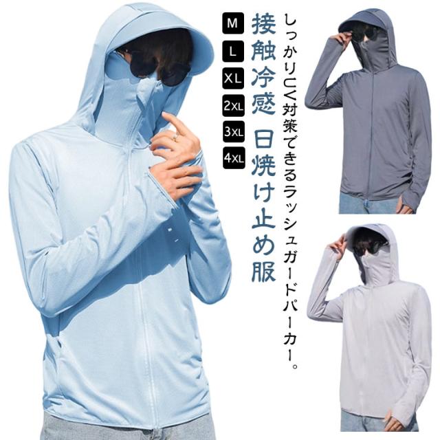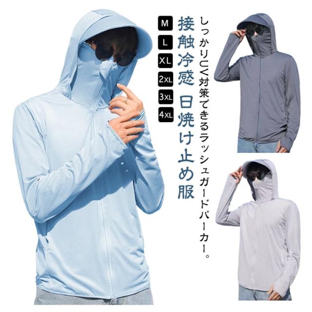 冷房対策 パーカー 紫外線対策 メンズ 接触冷感 日焼け止め服 指穴付き フェイスカバー付き UVパーカー つば付き 日焼け止め ライトアウター 涼しい ラッシュパーカー UPF50+ トップス UVカット ラッシュパーカー ラッシュパーカー 男女兼用 釣り 普段着 自転車 夏服