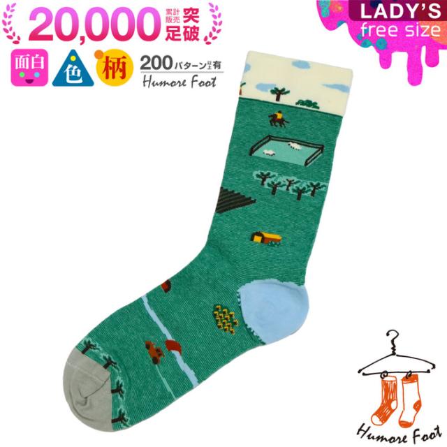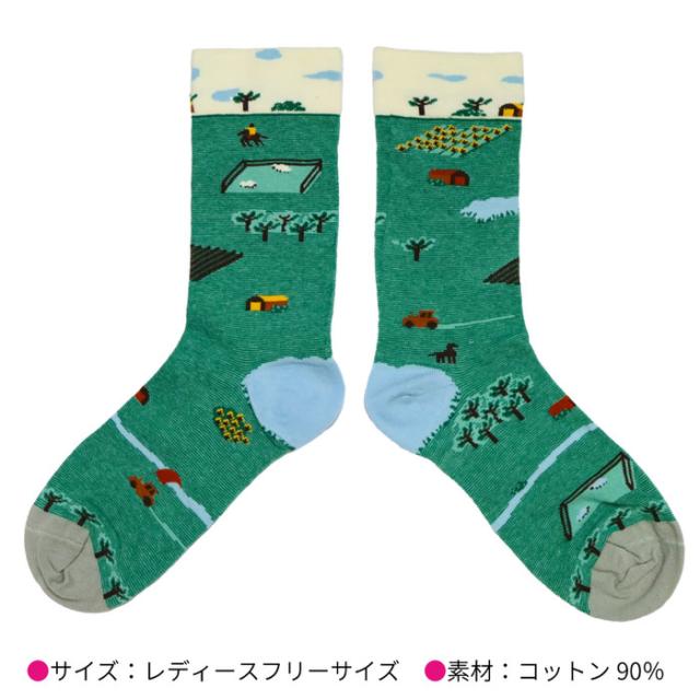 レディース ソックス グリーン 遠景 | レディース ソックス レディースソックス 靴下 ハイクルー丈 女性用 グリーン 柄物 コットン くつした 女性 カラフル 綿 おしゃれ socks 牧場 プレゼント 野原