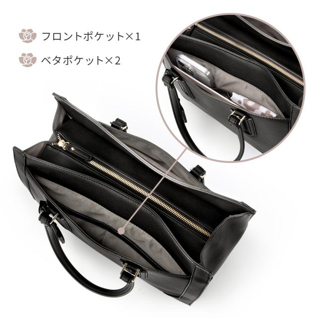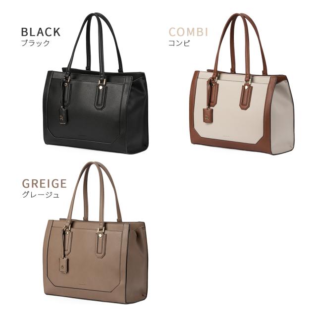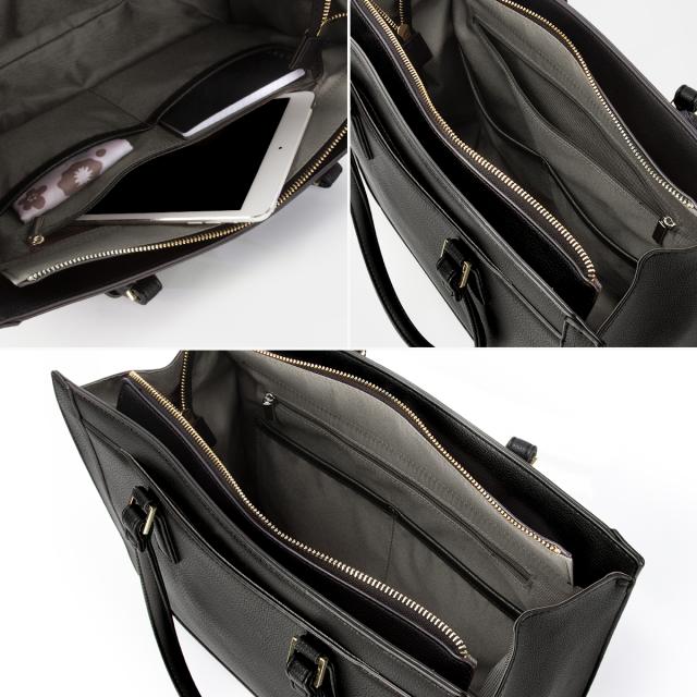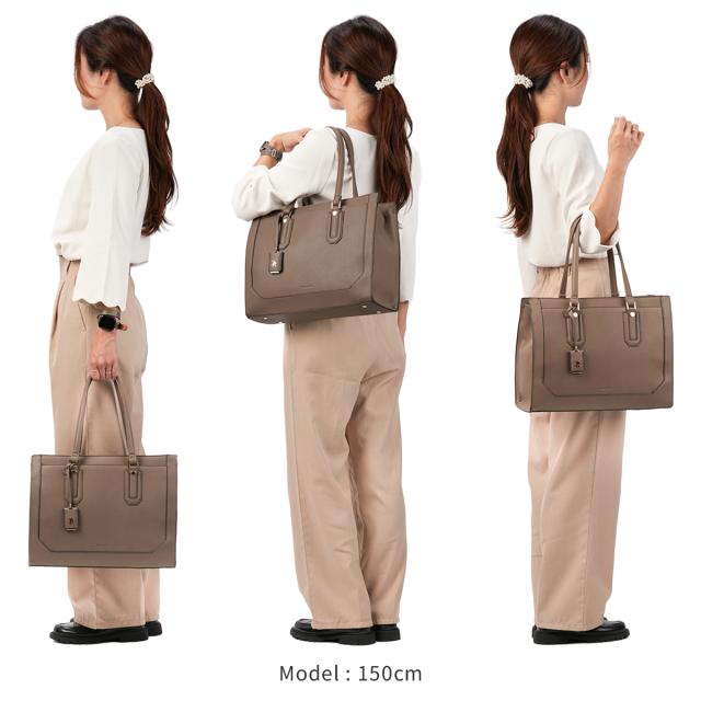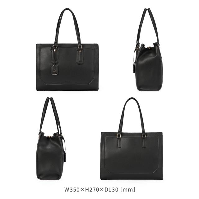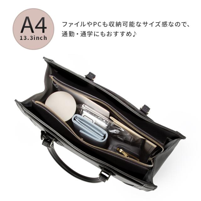 | 【おすすめポイント】 ・カットラインにまでこだわったデザイン ・A4サイズ/13.3インチPC収納可能 ・通勤・通学にぴったり ふんわりと柔らかな合皮を使用したトートバッグ。 カットラインにまでこだわった、高見えのするデザインです。 取り外し可能なチャームには、ブランドロゴのメタルパーツをあしらいました。 A4クリアファイルや13.3インチPCも収納可能なサイズ感なので、 通勤・通学にもおすすめです。 ※PCサイズ:W31×H22×D2.5cmで計測 底鋲がついているのも嬉しいポイント♪ スマートフォンや定期などの収納に便利な外ポケットの他、 内装にもポケットを複数設置しています。 【内ポケット】 ・ベタポケット×2 ・ファスナーポケット×1 ・クッション入りPCポケット×1 【外ポケット】 ・フロントポケット×1 ・フロントポケット内ベタポケット×2 ・背面ポケット×1 |