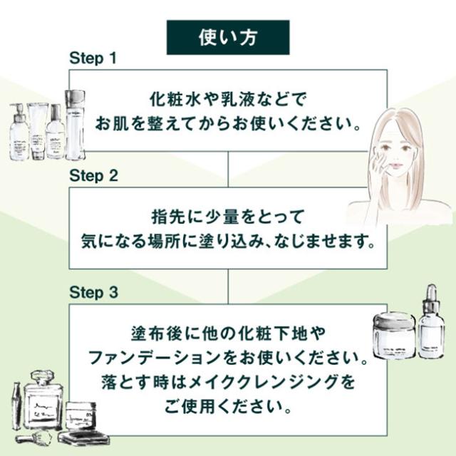 | 使用方法 | ・スキンケア後、気になる部分に少量ずつムラなく伸ばしてご使用ください。 ・その後普段お使いのファンデーションなどメイクをお楽しみください。 |