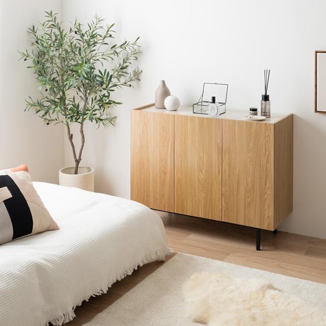 木目×無地のバイカラーが美しい、空間を彩るキャビネット。