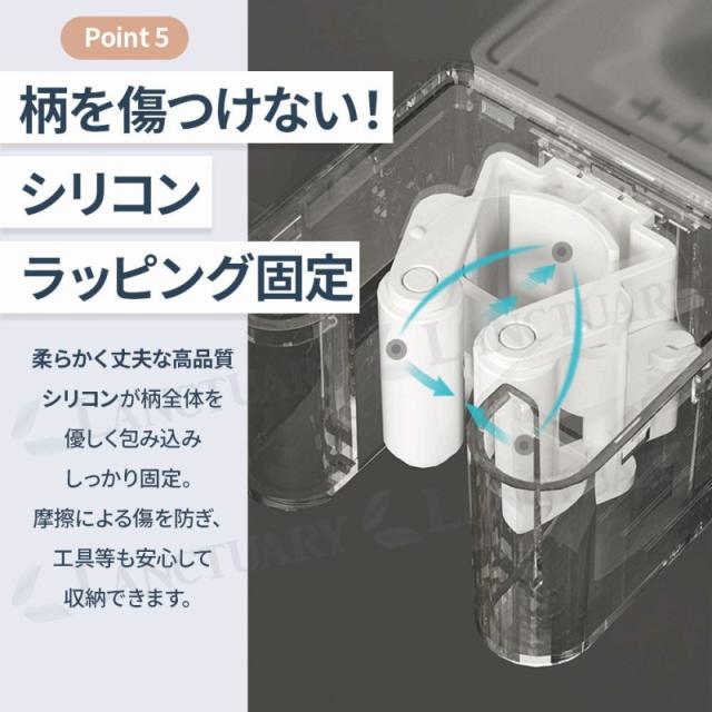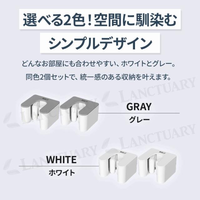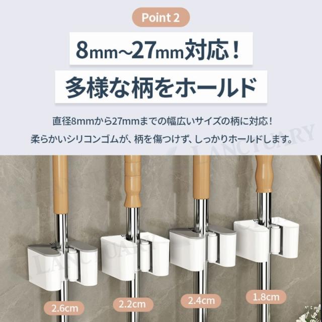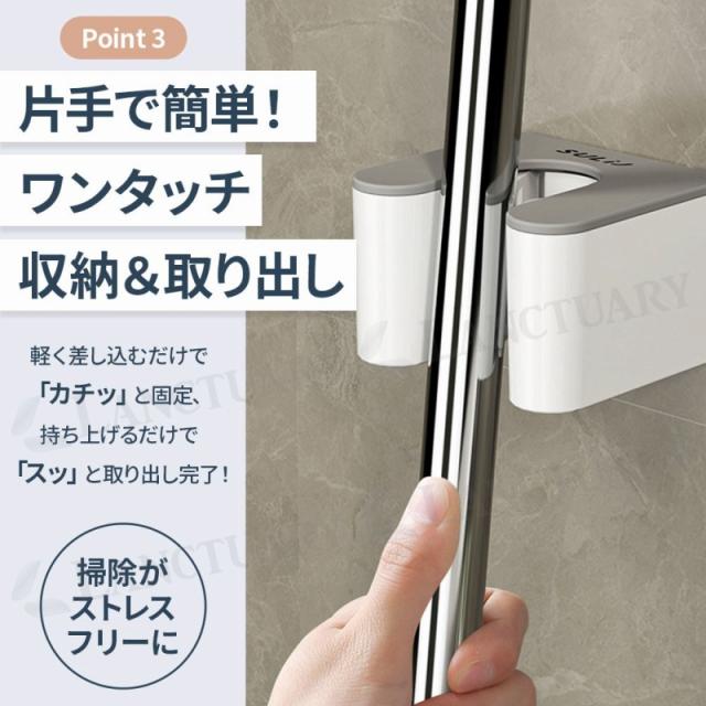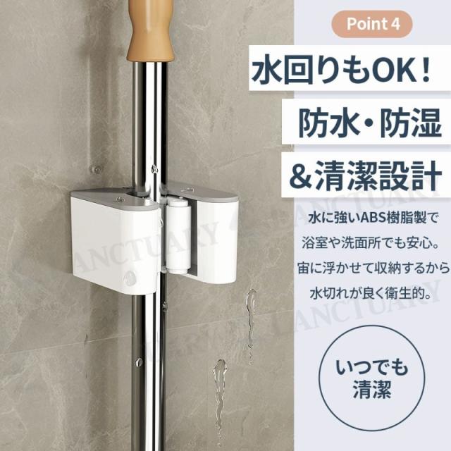 直径8mmから27mmの幅広い柄に対応し、モップやほうきはもちろん、傘などさまざまなアイテムを収納可能です。使いたい時にサッと取れて、片手で簡単に掛けられるワンタッチ操作も魅力です。水に強いABS樹脂製で、水回りでも衛生的に使える設計です。白とグレーの2色展開で、どんなインテリアにもしっくりと馴染むデザインです。
