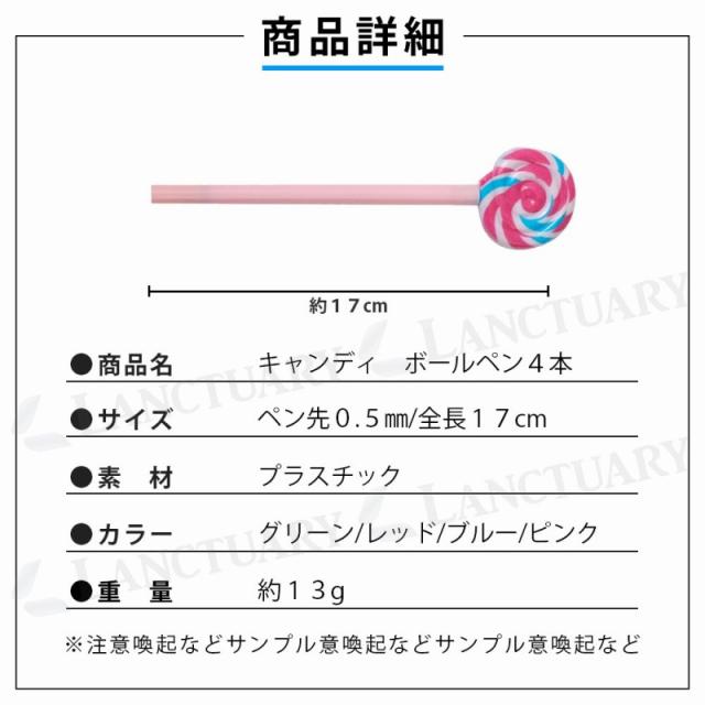| 主な仕様 | 商品名:キャンディ ボールペン4本 カラー:グリーン/ピンク/ブルー/レッド 材質:プラスチック サイズ(約cm):全長17 ペン先0.5mm 重さ(約):13g |