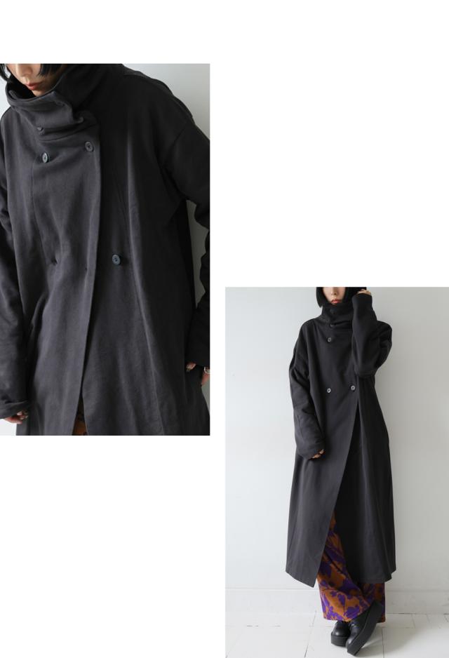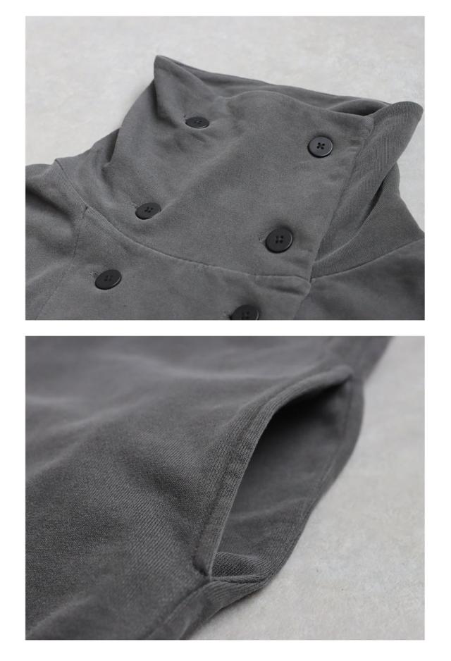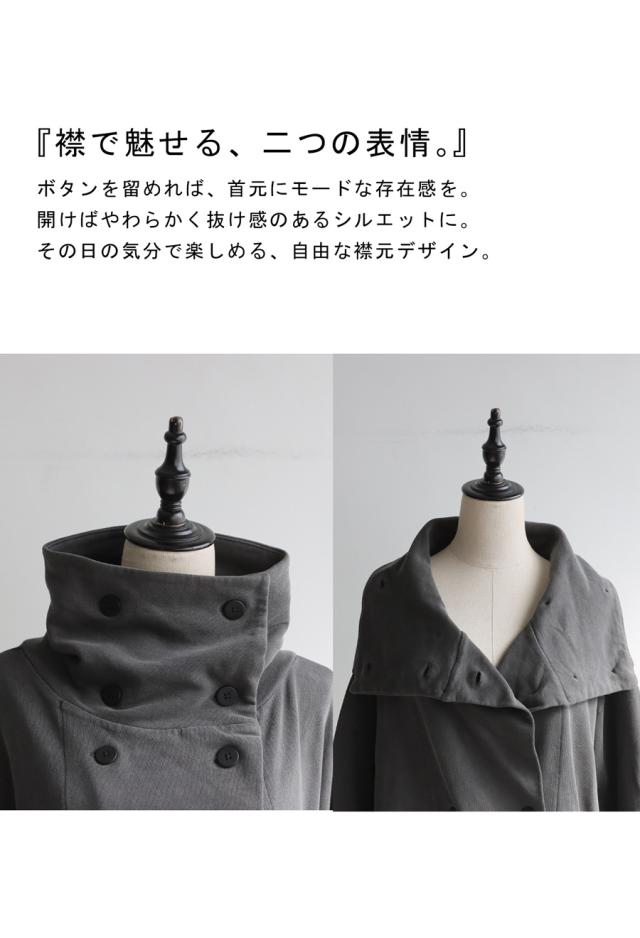 ハイネック(スタンドカラー)で小顔効果が期待できるネックラインは、襟を立ててもボタンを外してアシンメトリーにしても美しく決まり、スタイルに奥行きをプラスします。