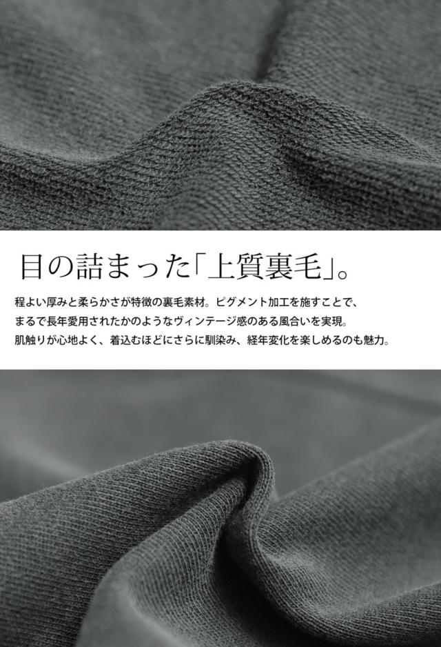 素材は程よい厚みと柔らかさが魅力の綿100%(コットン)裏毛生地で、ピグメント加工によりヴィンテージ感ある風合いを実現。