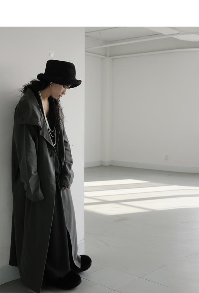 袖丈は手首を自然にカバーする長さで、丈感はロング丈。前開きでさらりと羽織れる形状で、軽やかさと存在感を両立。