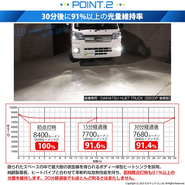 明るさ全光束8400ルーメンの最強のモンスターフォグランプLEDバルブです。放熱性能が高いため、長時間点灯後も91%以上の光量を維持します。30分経過後もほとんど明るさが変化しない放熱対策を施しています。純正球の配光特性に徹底的にこだわり、理想的な配光を実現しています。