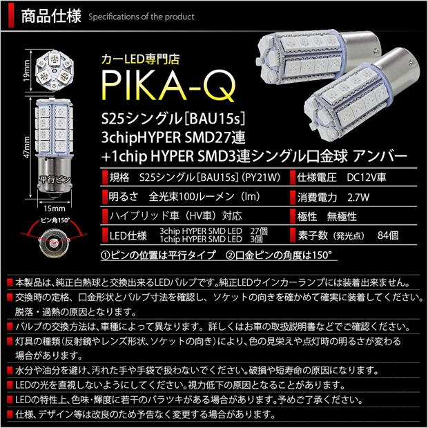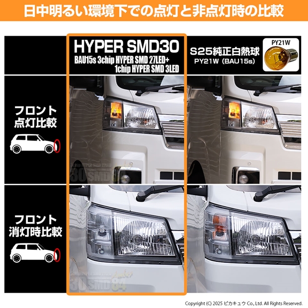 ウインカーランプ用S25[BAU15s]シングル口金球。HYPER SMD LEDを30個搭載。計84個もの発光点から放たれる強烈なアンバー照射光が魅力です。この煌めきがワンランク上のLEDメイクへと誘います!