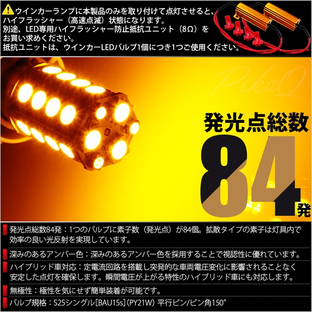 ◆ウインカーランプに本製品のみを取り付けて点灯させると、ハイフラッシャー(高速点滅)状態になります。別途、LED専用ハイフラッシャー防止抵抗ユニット(8Ω)をお買い求めください。抵抗ユニットは、ウインカーLEDバルブ1個につき1つご使用ください。