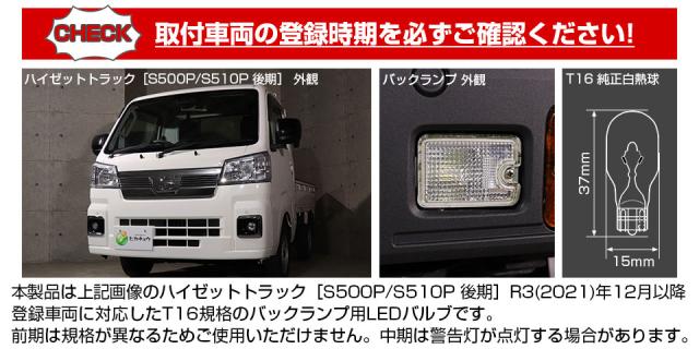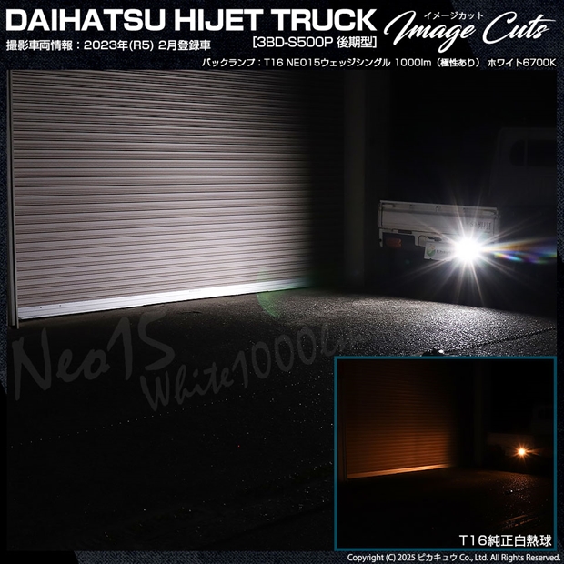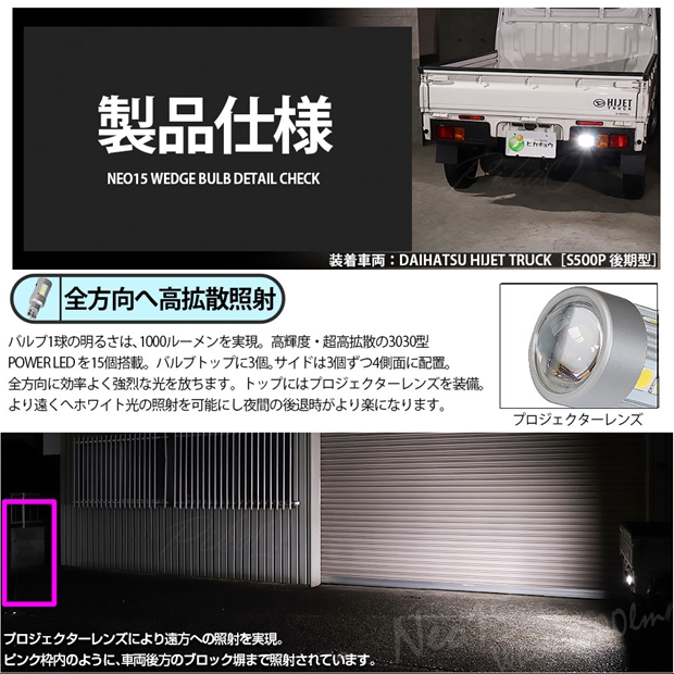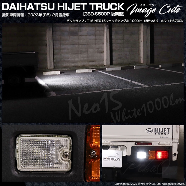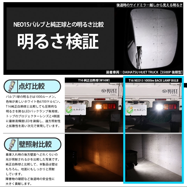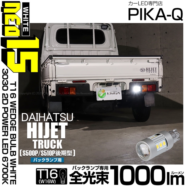 ピカキュウ,LED専門店,LEDバルブ,国産DC12V車,ハイブリッド車対応LEDバルブ,T16シングル,W16W,バックランプ,ホワイト,全光束1000lm,NEO15,ダイハツ,DAIHATSU,ハイゼット,ハイゼットトラック,HIJET TRUCK,S500P,S510P