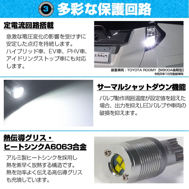 定電流回路を搭載し、車両電圧の上下に影響されることなく安定した点灯を持続します。LEDにかかる負荷を抑え、より長寿命を実現しております。 ハイブリッド車、EV車、PHV車等、さまざまな国産12V車に安心して装着していただけます。