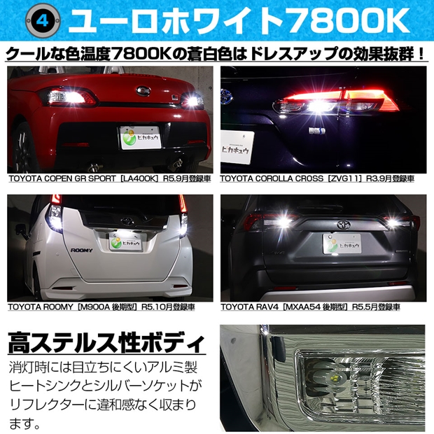 消灯時には目立ちにくいアルミ製ヒートシンクとシルバーソケットがリフレクターに違和感なく収まります。 全長は36mmと純正同等サイズのため、バックランプがT16規格の全車両に取付可能です。